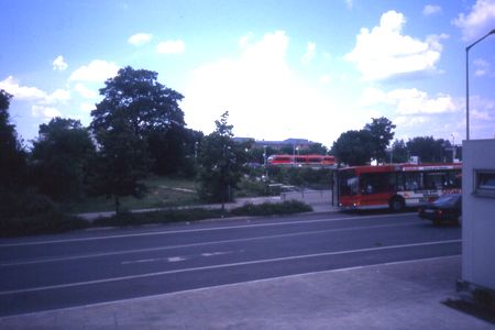 | Nürnberg-Nordost, vorn Bus 45 nach Thon, im Hintergrund Zug nach Gräfenberg |