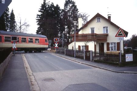 Zug kurz hinter Bahnhof Simmelsdorf-Hüttelbach, 2 Bahnübergänge |